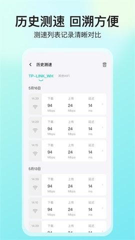 一键傻瓜式测速,下载速度、上传速度、网络延时图表实时跟踪显示。