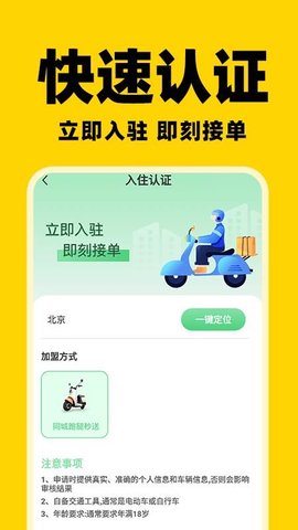 在线选择所在城市和加盟方式,上传证件认证资料,即可入驻平台接单。