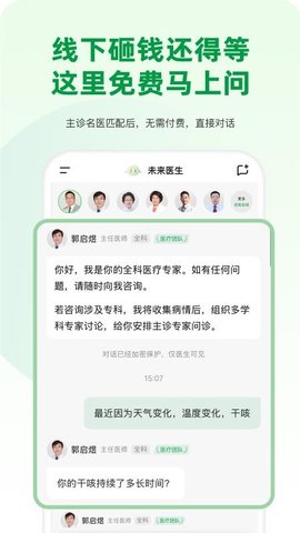 未来医生 app 让所有患者都能接触到优质医疗资源,用户可找到专家医生咨询健康病情,推动优质医疗服务的普及。在这里,用户能找到多位权威专家医生,无需线下排队挂号即可直接看病,轻松完成就医流程。这不仅能有效节省用户的看病时间,还能降低就医成本,让看病变得更加便捷。