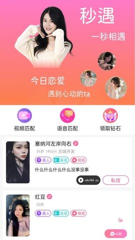 秒遇app以其全新的交友聊天服务,为用户带来灵活自由的社交体验。在这里,您可以根据自己的喜好查找志同道合的朋友,享受多样化的聊天交友方式。智能匹配系统助您快速找到最佳聊天对象,让交友过程更加有趣且高效。无论是寻找心灵伴侣还是结识新朋友,秒遇app都是您不可多得的选择!