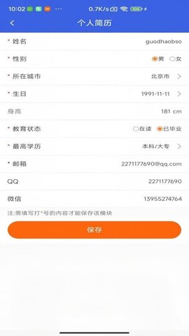 个人简历:支持编辑、完善个人简历,可填写详细信息。