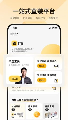 一站式装修服务:从设计、施工到售后,匠猫app提供一站式装修服务,让用户装修问题快速得到解决。