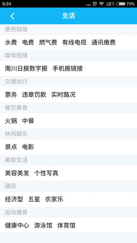 生活:便民链接、媒体链接、交通出行、餐饮美食、休闲娱乐、美丽生活、运动健身