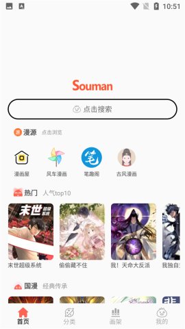 先在本站下载并安装 souman 漫画,安装后打开 app 进入主界面。