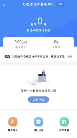 最近更新热门排行心理咨询师考试宝典是一款备考软件,提供题库资源及相关服务。用户可随时刷题,模式灵活,还能练习历年真题和模拟试卷,以便检测学习成果、发现薄弱点。软件会实时统计并可视化展示用户的学习时长、答题正确率等,助力高效提分。