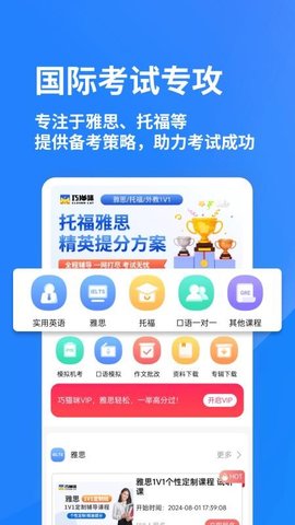 巧猫咪英语app作为国际英语备考学习平台,能为全国英语考生提供全方位备考辅导。它提供的学习资源实用性强,且所有资料和课程紧跟考试趋势更新,让用户获得优质备考方案,轻松掌握英语知识,顺利通过考试。