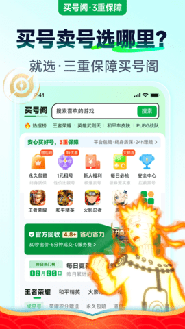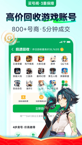 最近更新热门排行买号阁是一款针对游戏爱好者打造的账号回收交易软件,在这里你不仅能买到优质的游戏账号,还能将自己的游戏账号回收,轻松实现变现,实现账号的最大价值;诸多游戏账号类型,所有你玩的王者荣耀、和平精英、火影忍者、原神等全都有,并且有多种规格等级,可根据自己的需求自由进行交易,致力玩游戏更高效愉快。