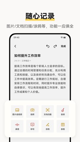 支持文本、图片、文档扫描、涂鸦、语音等多种记录方式,帮助您随时随地自由记录灵感。
