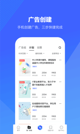 2. 推广管理:轻松管理广告组、广告计划、广告创意;