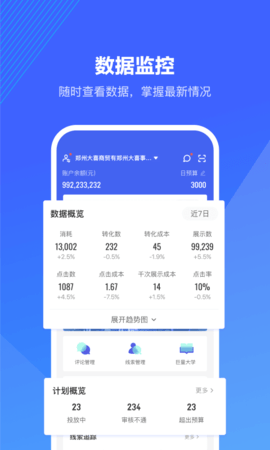 实时数据监控与优化:支持实时查看广告、账户各项数据,包括曝光量、点击量、转化率、花费等,让用户随时掌握投放效果。根据实时数据反馈,用户可及时调整广告策略,如优化广告创意、调整定向条件、修改出价等,确保广告投放始终处于最佳状态。比如,发现某个广告计划点击率较低,可通过 app 及时更换更具吸引力的广告图片或文案,提高广告的点击率与转化率。